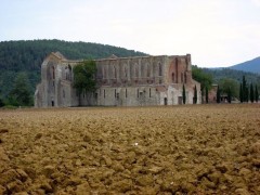 We drove into a flat-bottomed river valley and turned left towards a long straight line of trees bordering the access road to the cathedral. There beyond a freshly tilled farm field with great chunks of earth from whose color was derived the familiar pigment name of “raw sienna” was in fact a large 14th century cathedral. How very odd, there are no traces of a large town in the immediate area to support such a monumental construction, just farms and this abandoned cathedral. Apparently it was the medieval villages of Chiusdino and Monticiano along with the proximity to Siena and a route followed by pilgrims and soldiers that gave rise to the building of the cathedral which was started in 1218.